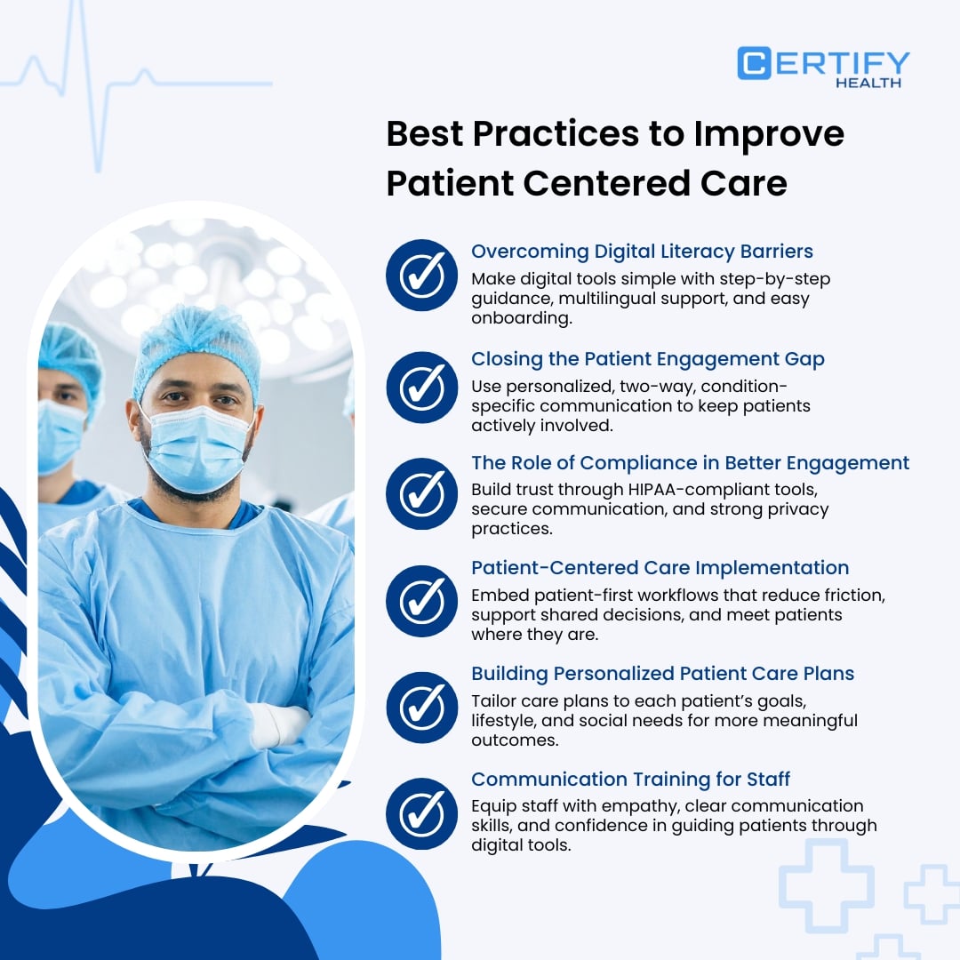 Improving patient-centered care is not only essential for patient satisfaction but also for better health outcomes, stronger trust, and long-term practice success. The following best practices outline how healthcare organizations can enhance patient-centered care through engagement, communication, personalization, and compliance-driven approaches.